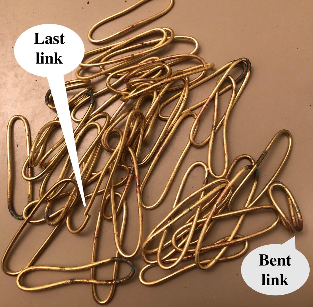 Note this is a DOUBLED loop-in-loop. Each link goes through two below it instead of one. I considered this style, but it would have been more than twice as heavy, since I would have needed longer links. I used 12 gauge brass wire.