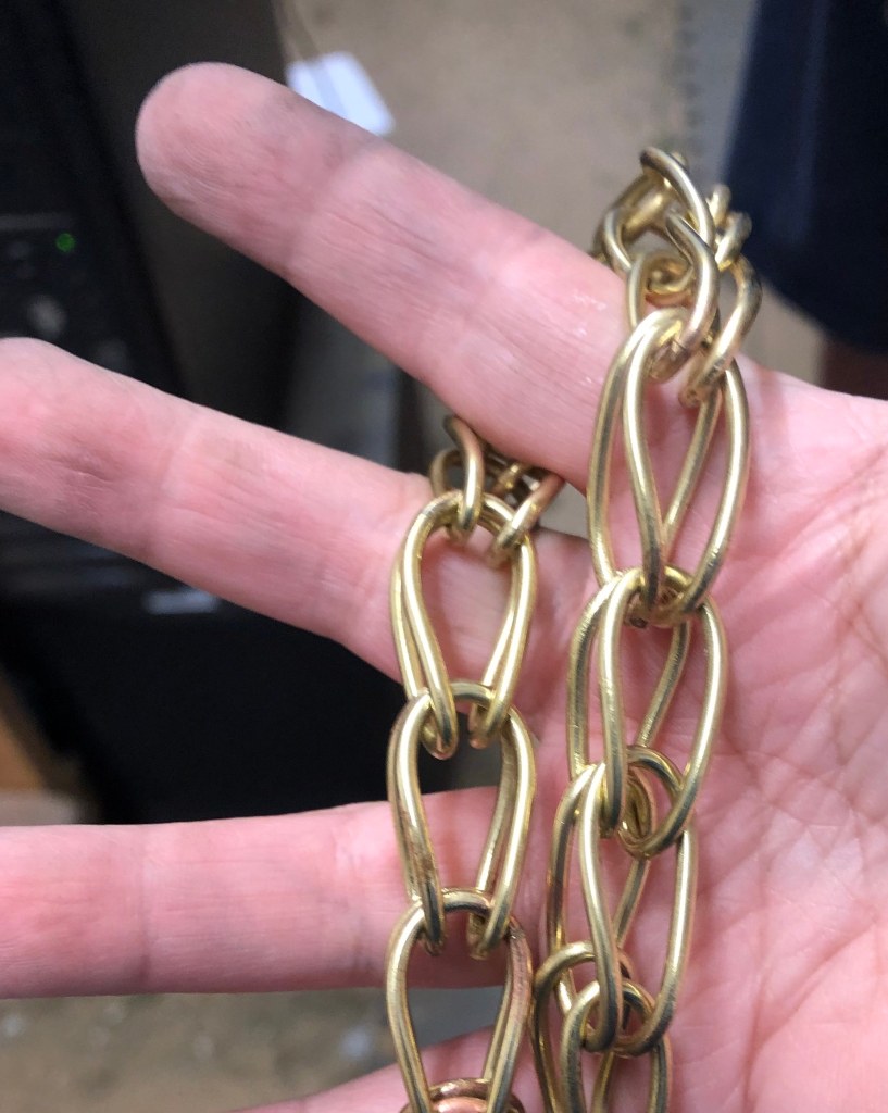 I wanted a continuous chain, so I created the last connecting loop by bending the wire in place and soldering it closed. Note that meant I had to cut that link differently, so the join was accessible after the bend. I used a wet paper towel to protect the previous solder joins during this procedure. The last step was polishing.