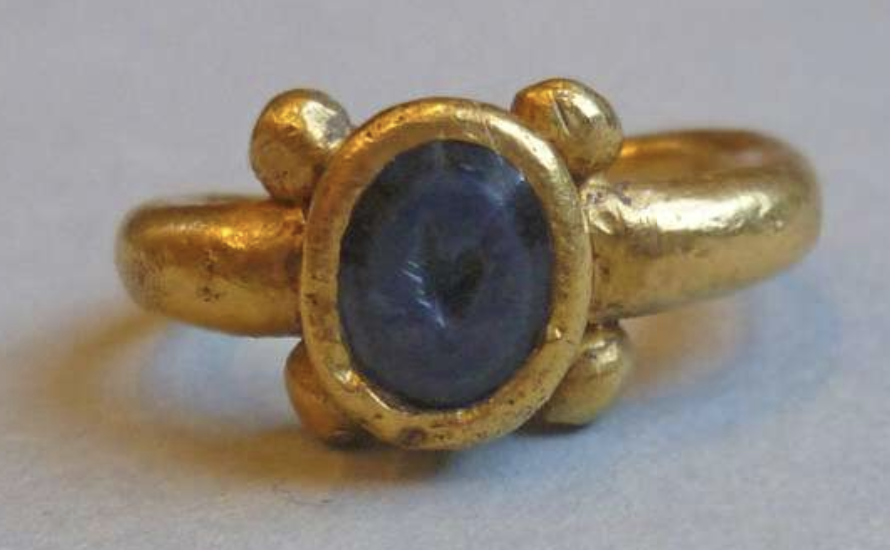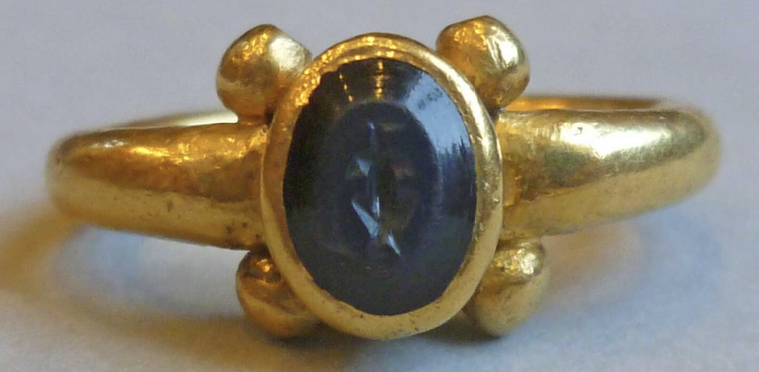 Gold finger-ring with plain hoop and raised gem-set bezel, with four large gold beads at the shoulders (Henig Type IV). The setting is an oval, dark blue nicolo (quartz), with a flat table and bevelled sides, engraved with two ears of corn. The gold shows considerable wear, with dents and scratches. Romano-British, 1stC-2ndC. Excavated/Findspot: Backworth Hoard.