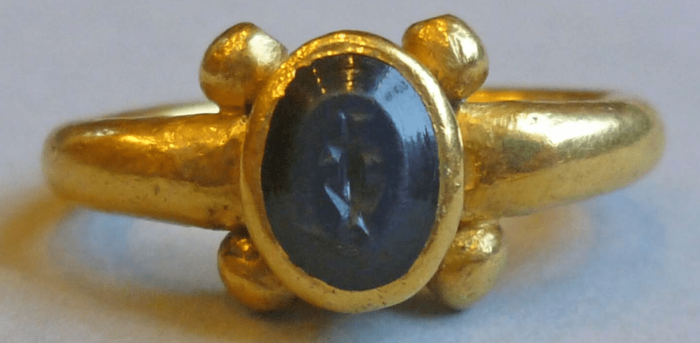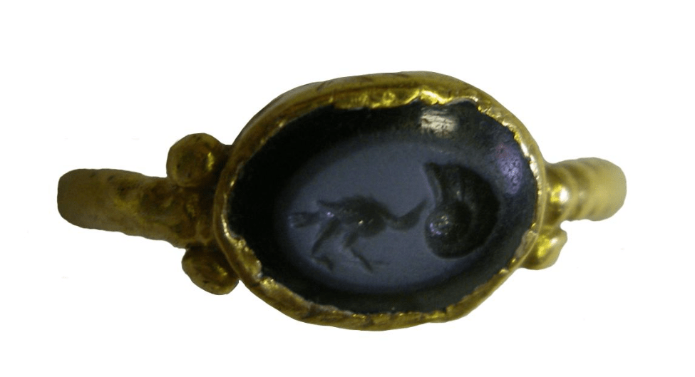 Gold finger-ring with plain hoop and raised gem-set bezel, with four large gold beads at the shoulders (Henig Type IV). The raised bezel is set with a dark blue nicolo (quartz) with flat table and bevelled sides. The gem is engraved with a stylised image of a trussed chicken. The quality of the engraving is mediocre, and there is some wear on the gold. Romano-British, 1stC-2ndC. Excavated/Findspot: Backworth Hoard.