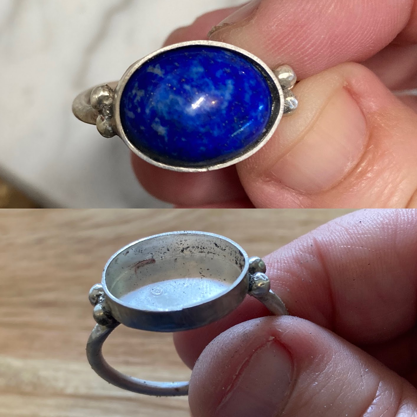 When I remade the ring, I re-oriented the stone vertically, as in artifacts 1&2 above. I also increased the size of the balls and shifted their location to more closely mirror the aesthetic of the originals. They ride low, providing strength and stability between the bezel and shank of the ring.